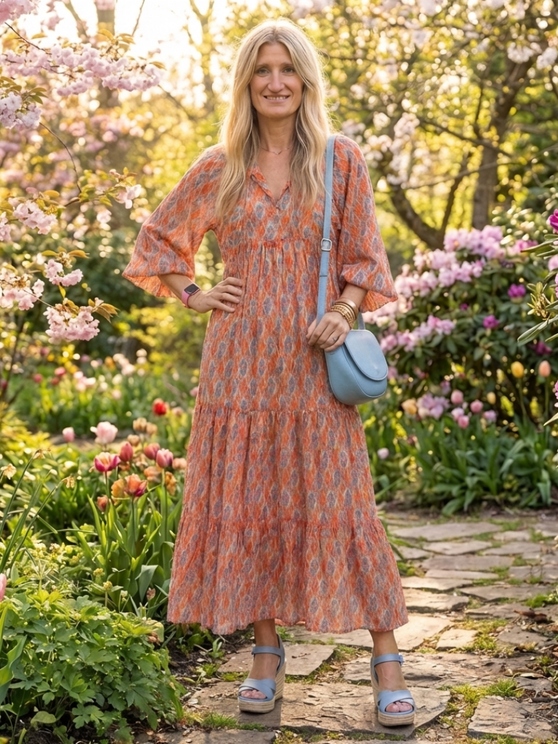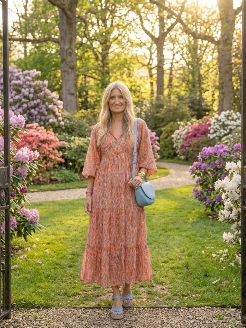En lördag på marknaden med en korg i handen. En afton hos vänner på landet där ingen är formell men alla är välklädda. En utställning på eftermiddagen som glider över i middag — klänningen följer med utan att missa ett slag.
