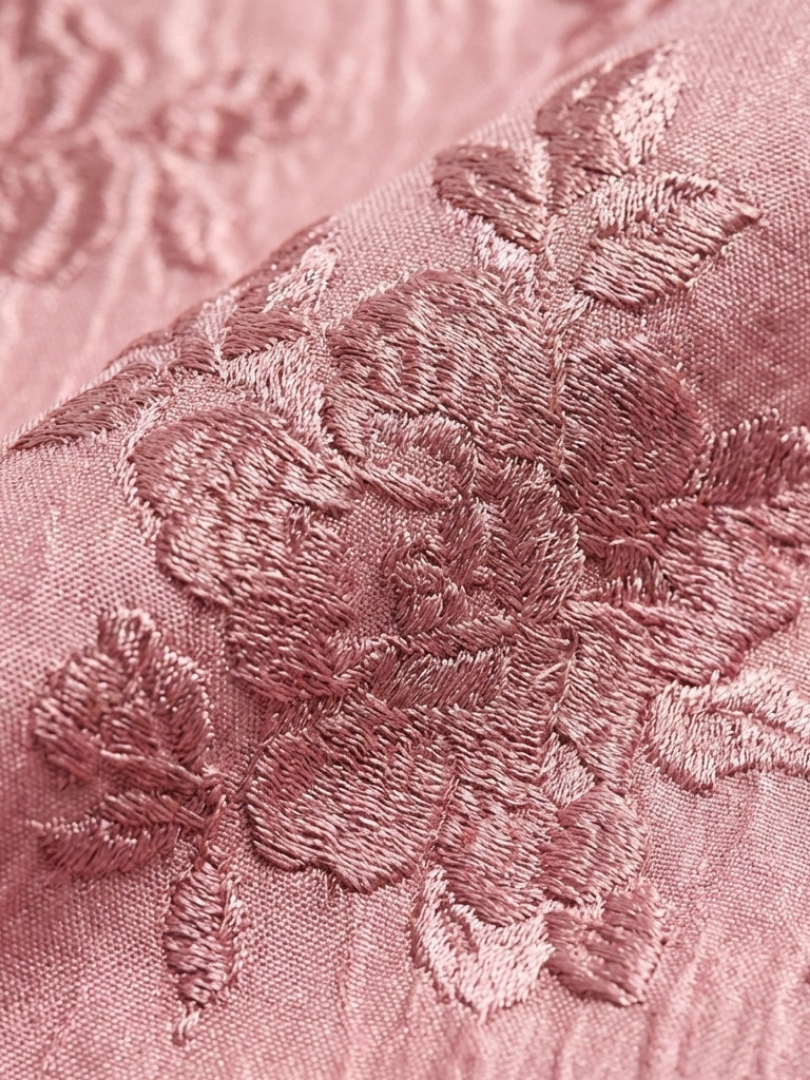 • Yta: Ton-i-ton blomsterjacquard med upphöjd reliefstruktur — mönstret syns i ljuset utan att vara uppseendeväckande